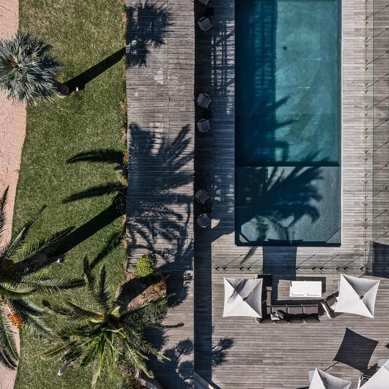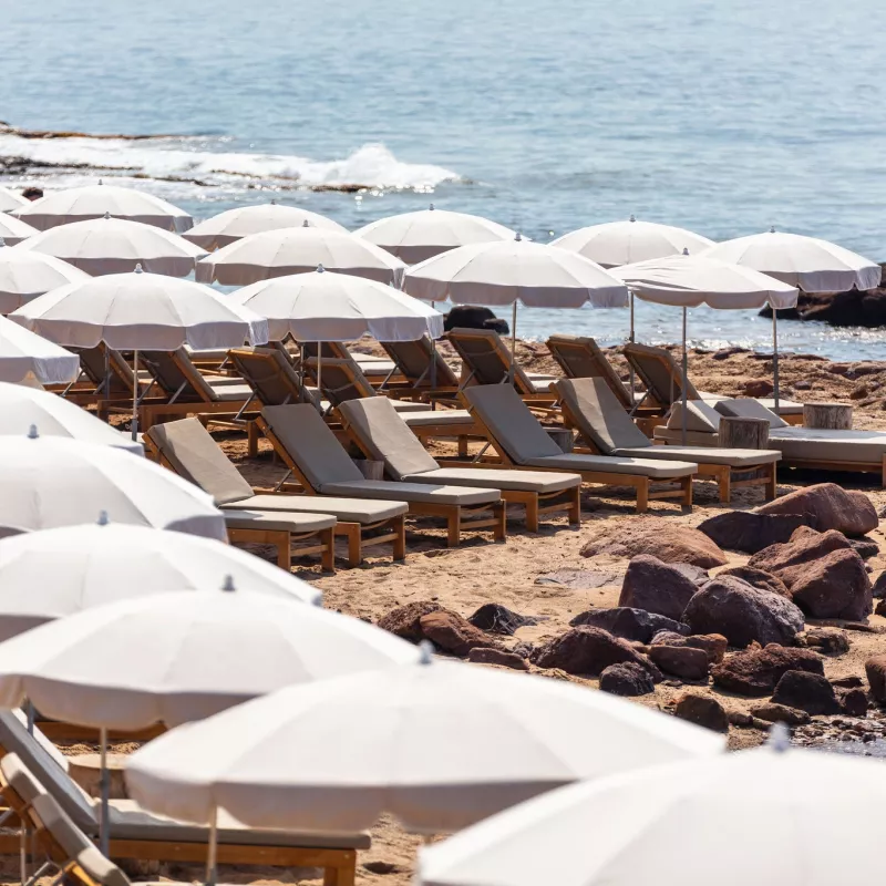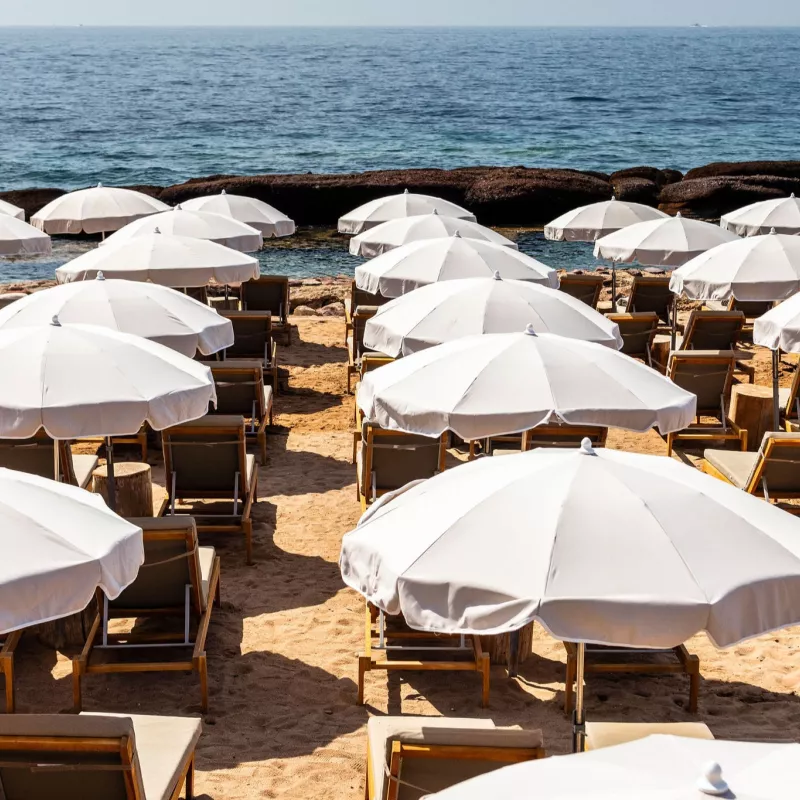 Réservée à nos hôtes, la plage privée offre un confort absolu grâce à ses bains de soleil, parasols et espaces dédiés au repos. Le solarium avec vue mer permet de profiter pleinement de la lumière méditerranéenne. Une invitation à savourer la douceur des journées en bord de mer, entre bains salés et moments de tranquillité.